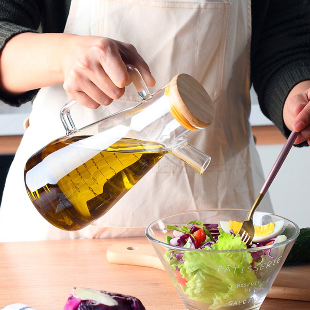 This oil dispenser is unique because it has a bamboo wood lid that has made the jar airtight. There is a cap over the spout to keep the content clean.